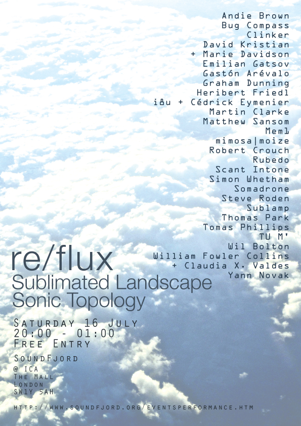 by Andie Brown on July 9, 2011July 12, 2011 I have a piece in the group show Re/Flux, curated by Soundfjord at the ICA on 16th July. http://ica.org.uk/29473/Music/Everything.html Related